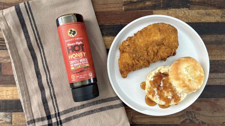 On the first bite of the biscuit, I tasted a surprising tang that I suspect comes from the vinegar in the ingredients. Drizzled over the chicken, the initial tang takes a backseat to the other flavors present.