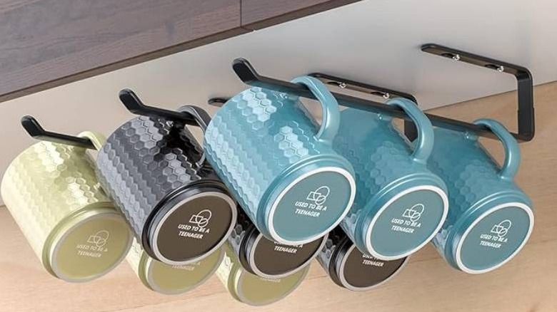 For a more efficient way to store your coffee cups, you may want to consider something like this Amazer coffee mug holder; it can easily be attached with screws, creating a sturdy home for your mug collection. Conversely, anyone hoping for a hassle-free installation can opt for an undershelf holder, like this YAMAKAZI under-shelf holder. By optimizing this space with adhesive or screw-on holders, you can say hello to a new resting spot for cleaning essentials or a display rack for decorative dish towels.