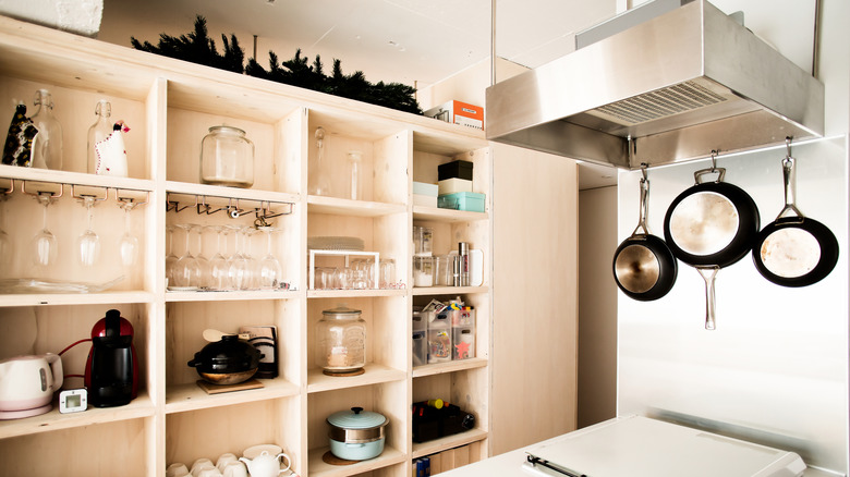 Now, if the thought of hauling a ladder to retrieve items from high shelves doesn't sound appealing, fret not. After all, pull-down shelf options are available to save the day. There are several conventional ceiling-mounted shelves to be found online, including this jkxoo pull-down alternative. It offers ease of access — even if you haven't been gifted with height — and as a side bonus, you can have your dishes disappear above when not in use.