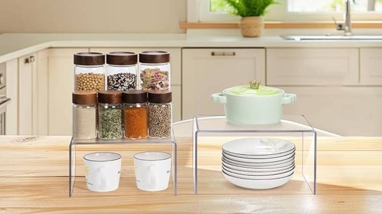 In your quest to avoid letting any inch of vertical space slip by unnoticed, you'll want to poke your head inside the actual kitchen cabinets to conduct a deeper inspection. To make the most of this space, opt for shelf risers that serve as a miniature ledge with legs — thus creating a second tier of storage space within your cabinet. By adding vertical dividers, you'll find the storage options within a cramped cabinet can effectively be doubled.