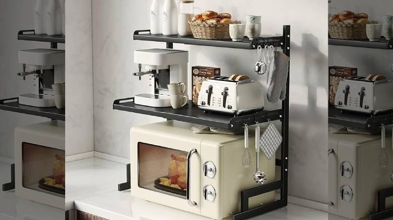 Furthermore, with the help of multi-tiered stands, you can potentially maximize a vacant area above the microwave, as well. This three-tiered stand by Rasegicc or any similar options with multiple shelves will help you store gadgets (like an air fryer) or frequently used condiments without placing them directly on the appliance.