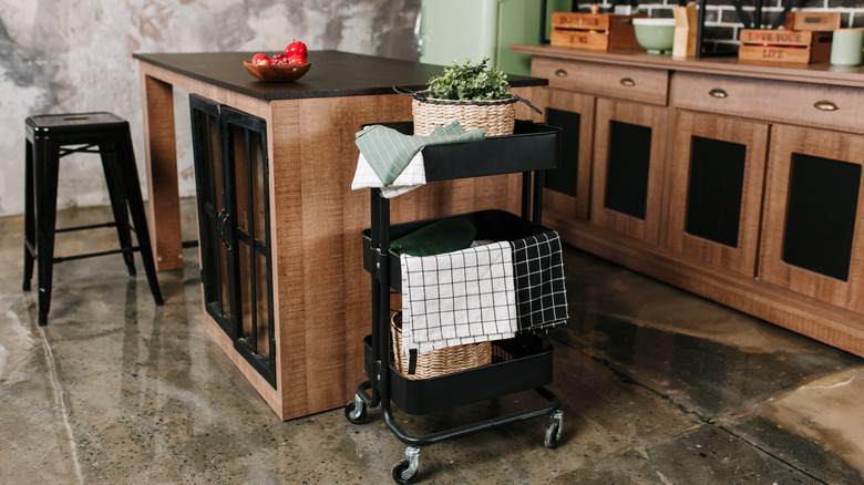 Beyond generating additional storage and serving as a workspace area, the beauty of a trolley lies in the fact that it can be wheeled in as needed. For instance, you can use it when hosting guests for the holidays, and relegate it to the basement once done.