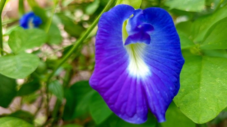 Butterfly pea flower, scientifically called Clitoria ternatea, is an ornamental flower named for its appearance, rather than any attribute it might have for attracting butterflies. Its vibrant petal is only a few inches wide, with a pistil that is often green or white. The vine is native to Southeast Asia, where it's used in Thai, Malay, and Peranakan food. If left to fruit, it produces a small, flat legume pea which is edible when harvested early enough to be tender.