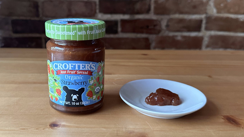 When you want to feel like you're eating the freshest possible strawberry jam, turn to Crofter's organic strawberry fruit spread. If you're used to eating more sugar-forward jams (as opposed to fruit-forward ones), you might be slightly turned off by its color. It has a brownish tinge to it that doesn't look as bright as many of the other jams listed here. However, that just means you're getting more fruit in the jar. Once you spoon some jam out of said jar, you might notice its fibrous texture — you can tell that there is plenty of actual fruit here.