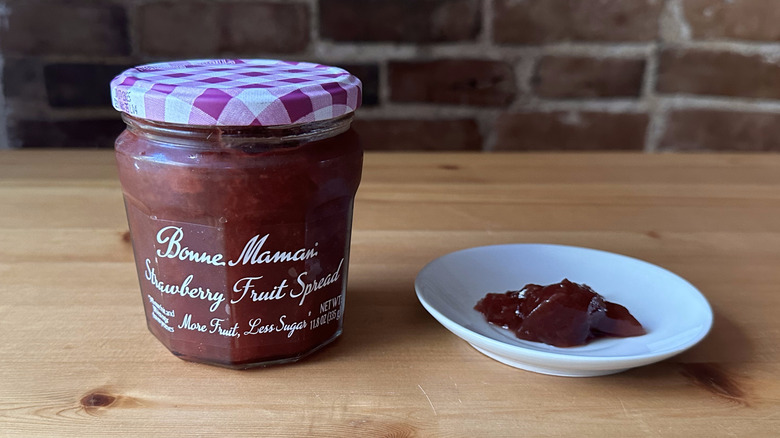 There is perhaps no jam brand that gets quite the same hype as Bonne Maman. The brand is known for its iconic advent calendar that features a range of different flavored tiny jams. You can also reuse its trendy jars for your morning coffee. (Plus, the lid is undeniably cute.) But this brand isn't beloved just for its jars — the product is actually very good quality, which is why Bonne Maman's strawberry fruit spread ranks number two on this list. Compared to the brand's preserves, this strawberry jam contains more fruit and less sugar, which means you're going to get a tarter, more fruit-forward flavor. That really works with strawberry specifically because it creates a lighter, more summery flavor profile.