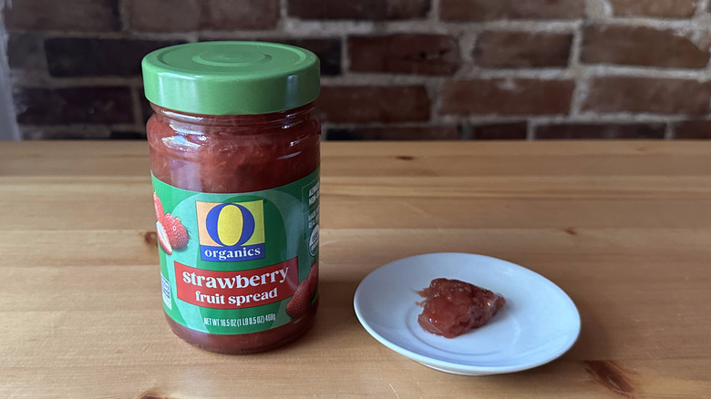 If you're looking for a strawberry jam that's a step up in quality from most of the other brands you'll find on store shelves, look no further than O Organics strawberry fruit spread. This jam contains organic strawberries as well as organic cane sugar, which is largely where its mild sweetness comes from. That lack of high-fructose corn syrup is a plus, and if you care about shopping organic, you should be pleased with the ingredients list here. Although this fruit spread is sweeter than My Normal's jam, it still has a lovely touch of acidity to it, which keeps things tasting fresh.