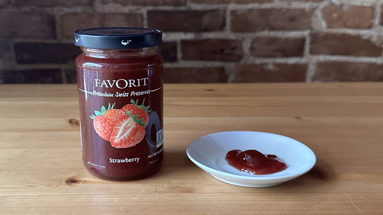 You may not be able to find Favorit strawberry premium Swiss preserves everywhere, but if you can get your hands on this product, it might be worth a try. As the name suggests, this product hails from Switzerland, and according to the packaging, it's made with 52% fruit. Now, would it be better if this number was higher, meaning that there were less sugar and fewer additives in the recipe? Sure. But still, this product is made with mostly real fruit, and its flavor certainly makes that clear.