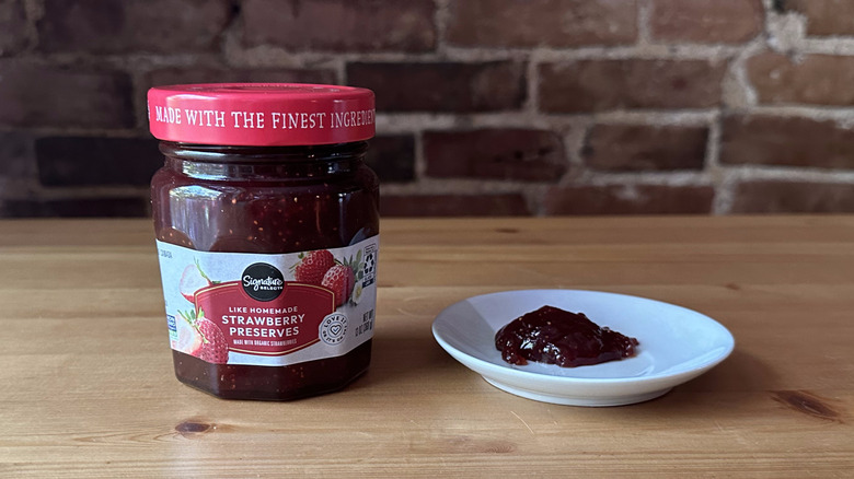Signature Select's strawberry preserves is another spread that doesn't exactly boast the best of ingredients. While it's a great choice if you're trying to pinch pennies at the grocery store, if you're looking for the most delicious strawberry jam on store shelves, you might find it falls flat. It's a step up from Smucker's, largely because it actually contains seeds, which offer that subtle crunch you'd get from actually eating the fruit.