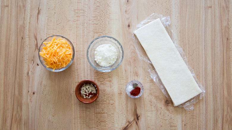 For this recipe, you will need a puff pastry sheet. Make sure it's fully thawed and kept cold. You'll also need shredded cheddar cheese and grated Parmesan. Have minced garlic at the ready as well as ground sweet paprika, salt, and black pepper. It doesn't take much to create this delicious snack.