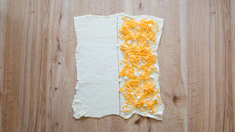 Evenly distribute the cheddar and Parmesan over one half of the pastry.