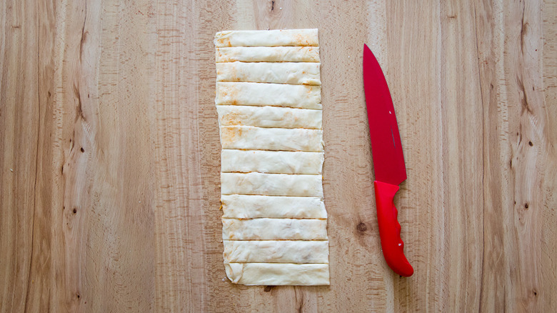 - Press the folded pastry gently, and cut it into strips about 1 inch wide.