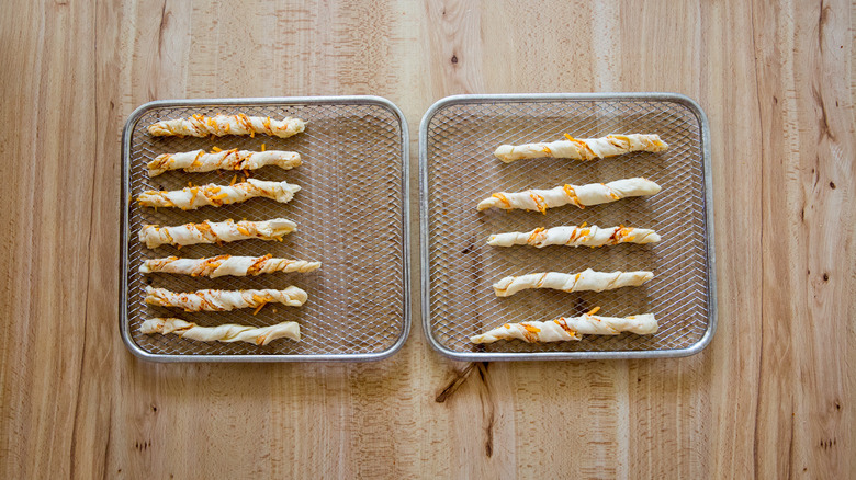 Recipe developer Michelle Bottalico has created a recipe for air fryer cheese straws that are quick, easy, and delicious. Cheddar and Parmesan cheeses are distributed on a thawed puff pastry crust and flavored with minced garlic, paprika, salt, and pepper, and then the pastry is folded in half and cut into strips. The most precise part of the recipe comes next — twisting each strip into a spiral — but it's also fun to see the colors and textures come alive as you twist. All that's left is to air-fry the straws until browned and crispy. Not only are these cheese straws irresistible, but they look great with crispy cheese peeking out of multicolor spirals. Serve this savory finger food at your next party: No one needs to know how easy they really are to make.