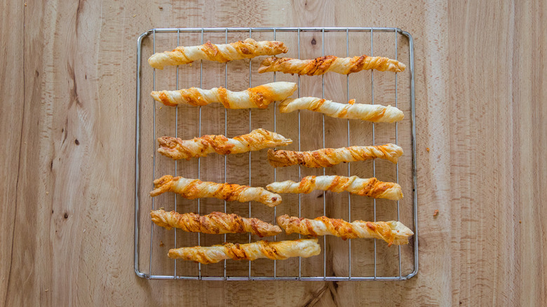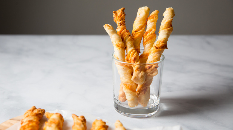 If you want to make homemade dough and go a slightly different route, you can make a type of cheese straw dough from scratch that's popular in the South. The dough is made from flour, butter, cheddar cheese, and spices, and has the consistency of cookie dough. To make the straw shapes, the dough is passed through a cookie press with a star-shaped attachment on the end. The baked straws have the perfect texture to pick up and bite into, with characteristic ridges from the press still visible on the outer surface. A cookie press isn't the most common kitchen gadget, so if you don't have one, here's a workaround. Roll the dough into a very thin rectangle, cut it into strips, and twist them like we've done with our puff pastry strips in this recipe before placing them on a baking sheet and baking.