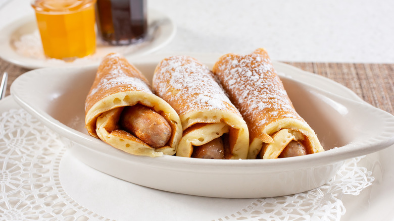 If you've never had pigs in a blanket, you're sorely missing out. This tasty treat is super easy to make: just take some kind of sausage, roll it up in your choice of relatively flexible bread product, and you're good to go. Typically, people use hot dogs or cocktail wieners and crescent rolls, but you can make an easy breakfast version by replacing the rolls with your favorite pancake instead. We have an easy pancake recipe that's a cinch to make. All you need to do is heat up your sausage of choice, take your freshly finished (or reheated) pancake, and roll that bad boy up.