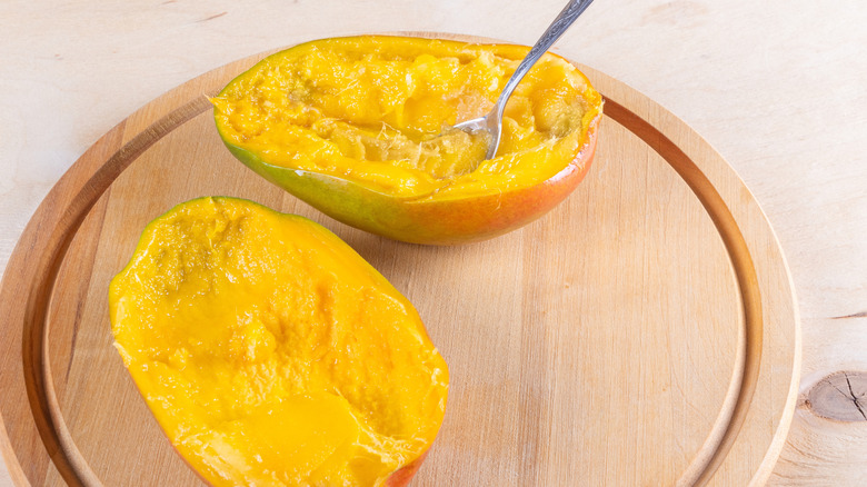 If you're internet savvy, you may have heard about the viral glass method of mango peeling. It works for several types of fruits like kiwi, but has made its claim to fame with our favorite fruit, the mango. This method is mess-free and one of the fastest ways to get the job done. The unexpected item you can use to peel your mango, is, you guessed it, a standard drinking glass. It's a good method to consider if you're looking to peel big chunks of mango, but not leave the fruit whole.