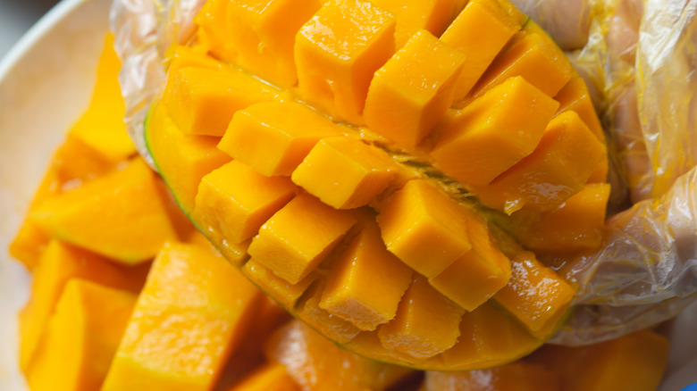 Scoring the flesh of the mango is a popular method that is mind-blowing to those of us trying it for the first time. It works well if your plan is to enjoy mango on the go, or if your ultimate goal is to slice up some diced mango, perhaps for an easy mango salsa recipe. Either way, it's one of our favorite methods because it's hassle-free and mess-free. Start by washing your mango and cutting it into large sections using a sharp knife. Then, slice into the sections of the mango on the flat cut side, leaving the skin intact. Score it with cross-hatching, leaving the squares about one centimeter thick or smaller.