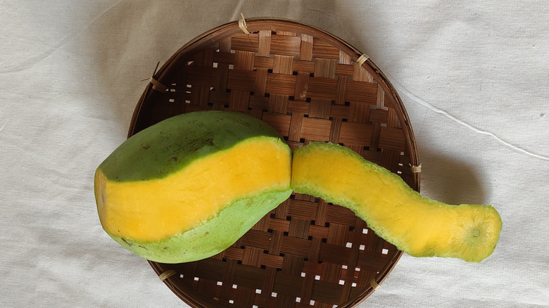 Like all fruits and vegetables, there comes a time when mangoes begin to oxidize. This creates browning and makes it less desirable. The skin of fruit does a pretty good job of preserving the flesh, but the second we cut into fruit or remove the skin, it's at the mercy of the open air. With this in mind, the ultimate mango peeling hack you need to know is all about when to peel your mango.