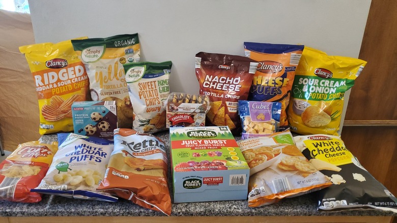 After purchasing these snacks from Aldi, I sat down with my family to sample them all. We taste-tested all of these in one sitting to make sure we had a clear recollection of the flavor and texture of each when ranking them. When tasting, we each shared notes about the texture, the strength (or lack thereof) of the flavor, and how satisfying we thought each would be as a standalone snack. While there were a few that we had some differing opinions on — like the Lunch Buddies Chocolate Pudding Cups that my kids said tasted great, but my husband and I both didn't like at all — we seemed to have a similar consensus on most of these.