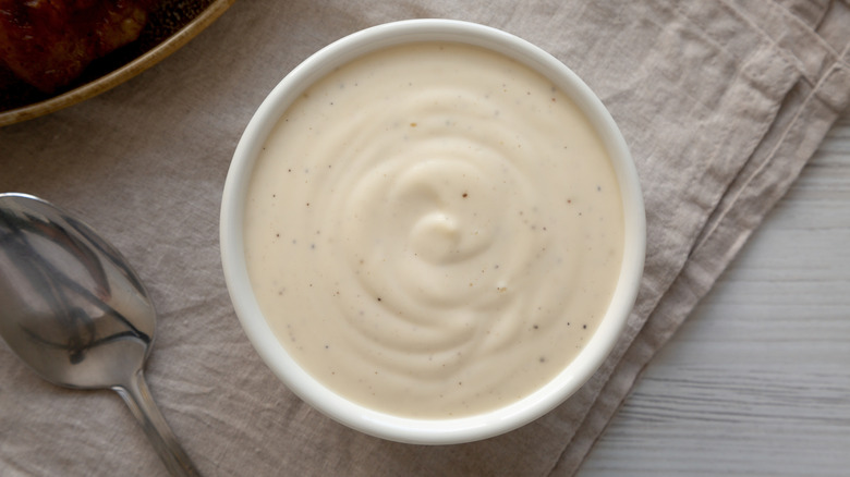 It makes a fantastic option to drizzle over your fish as you are assembling the sandwich, giving a final burst of flavor. You can also customize the heat level with added hot sauce to give it a spicier kick with a slight tinge of color — in that case, perhaps it isn't as white of a sauce. Don't have hot sauce? You could replace it and use cayenne pepper and horseradish instead. Since Alabama white sauce is associated with barbecue, it can work particularly nicely with a grilled or fried fish.