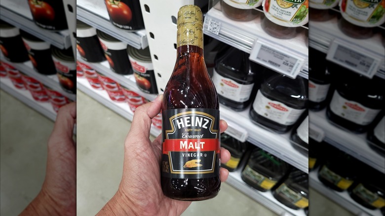 Aside from tartar sauce, malt vinegar might be the first thing that comes to mind when you're imagining dressings for fish; it's a staple for a reason — its tanginess and mild sweetness bring a bold note to fried or grilled fish in just a quick splash. It's more of a liquid than a sauce (like many other dressings on this list), and it's a pungent way to upgrade any fish sandwich. There's no wrong way to incorporate malt vinegar because it acts similarly to adding a squeeze of lemon to your fish. It's sharp and bright, just where it needs to be, but it's multi-dimensional with its light, sweet notes.