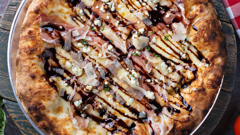 Using balsamic vinegar on your pizza offers another quick fix for a pie in need of extra "oomph." A fast drizzle drawn on top of your ready-to-serve pizza is all you need to turn up the dial of flavor and presentation. Suddenly, an item that was clearly pulled out of a package becomes a marvel to serve, and when layered with other added ingredients — think extra crumbles of goat cheese, a handful of chopped chives, or parmesan flakes — you'll have a meal that is all but promised to deliver in both the taste and aesthetics departments.