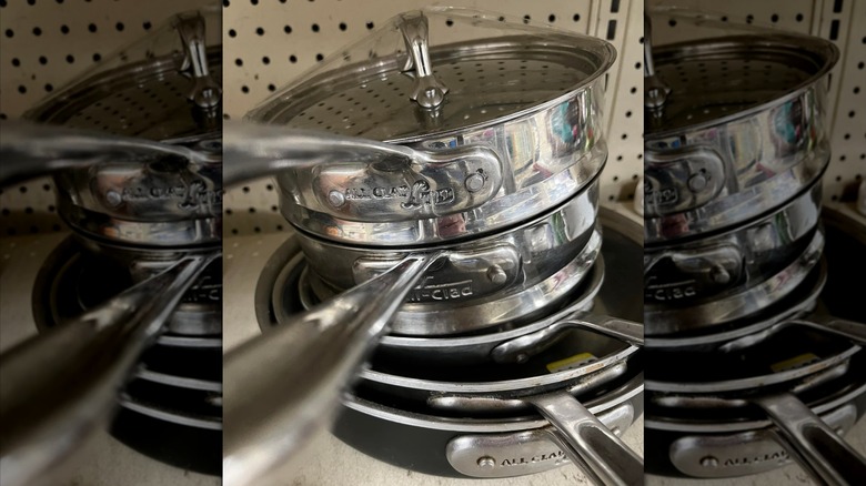 The company still makes plenty of high-quality products, but it's the stainless steel ones that are true classics. They have three layers of metals, are heat safe up to 600 degrees Fahrenheit, and work on all sorts of stovetops, including induction stovetops. With how long they last, coming across any piece in a thrift store is a true prize, especially if you can find one for under $20, since it's going to last you a lifetime. After all, a new stainless steel All-Clad small saucepan starts around $100.