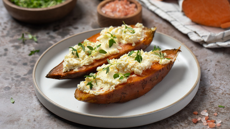While you're at it, you can add a few more ingredients to those open crevices. Salt and pepper usually do the trick, but just imagine how much more enticing the sweet potatoes will be if they are laced with aromatic herbs or sparkle with a hint of spice from cayenne pepper. A slather of butter can work a miracle as well, adding that irresistible fragrance that captivates the senses the moment it leaves the oven. Don't miss out on the opportunity to infuse the sweet potatoes with more flavor intricacy when you're making this simple change.