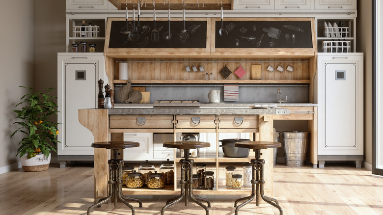 When searching for vintage accents to balance the onslaught of modern appliances that a kitchen requires, you can choose to start out small: a vintage caddy or cake display stand here, a distressed wall hook there. When you feel ready to move on to larger silhouettes, you can explore antique wall clocks or open shelving with iron brackets. Style the latter with an assortment of your favorite flea market finds, from handcrafted ceramic dishes to baroque planters, to round out the look.