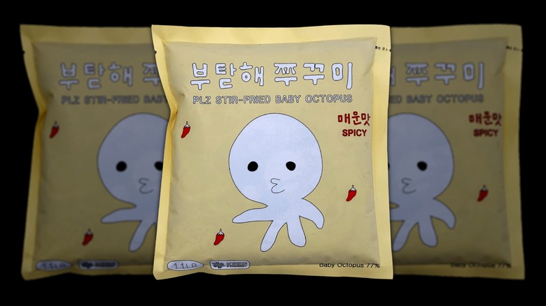 You can't find baby octopus everywhere, much less baby octopus that has already been seasoned with a spicy and savory sauce that makes a seafood-based dinner easier than ever. That's why we love snagging some Plz Stir-Fried Baby Octopus at H Mart. This prepared seafood has a nice, springy, and perfectly chewy texture, but it's the seasoning that makes it shine. It packs some heat, but it's not overwhelmingly spicy. You can always add extra gochugaru if you want an extra dose of heat. It also has a lovely nutty complexity to it, which rounds out the flavor. And the best part? It comes together in only a few minutes.