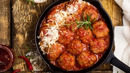 Spanish chorizo's smokiness and piquant garlicky flavor will pair well with many meatball recipes while also opening the door to different sauce and side dish pairings. While chorizo will taste delicious when incorporated into our parmesan and oregano-infused Italian meatballs, you can also honor its Spanish roots by incorporating it into these Spanish-Jewish lamb meatballs (as long as your diners eat pork) with spices like cumin, cinnamon, and harissa paste. They'd also bring a meatier chew and a smoky upgrade to this adapted recipe for rock shrimp polpette. To accompany your meatballs, you can add Mediterranean and Middle Eastern flavors to a foundational red sauce by starting with a Spanish sofrito of pureed garlic, peppers, and onions. Simmer the meatballs in the red sauce and serve over couscous or saffron rice with peas for a pop of color.