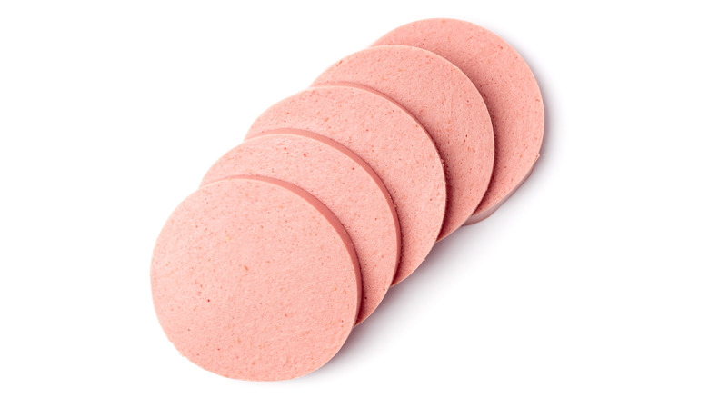 For example, bologna is a lot more uniform than mortadella, in which chunks of fat and leaner parts of the meat are often visible just in the coloring of the cold cut. Similarly, mortadella is usually spiced and enhanced by an array of different ingredients, while that's not traditionally the case for bologna. Therefore, mortadella usually offers a much more flavorful experience. Lastly, while mortadella is made with pork, bologna can be made with pork, beef, chicken, turkey, or a mixture of any of these meats.