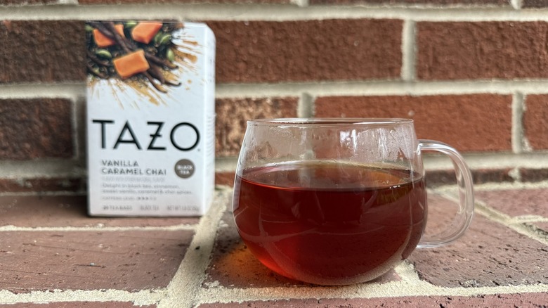 Tazo's Vanilla Caramel Chai features a blend of black teas, cinnamon, licorice root, cloves, black pepper, ginger, and natural flavor. It has a medium caffeine content, making it a product you might reach for in the first half of the day. Adding vanilla and caramel to chai is not a new concept, but each brand does it differently, so I was excited to try this product.