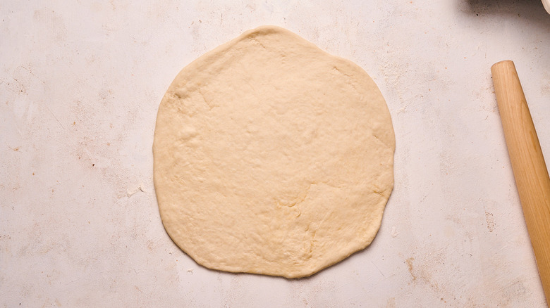 - Flip the dough onto a floured surface and gently roll into a large circle about 12 inches in diameter.