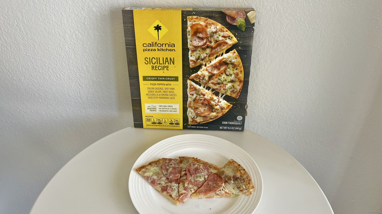 The Sicilian recipe pizza has the thinner, crispy crust that we are very familiar with by now. You'll find this one topped with meats like Italian sausage, Genoa salami, and thinly sliced spicy ham, effectively making it a meat trio — perfect if you want a meat lover's pie, as this is the most meaty one on the list. There's also mozzarella and Fontina cheese, marinara sauce, and a bit of sweet basil to punch it up.