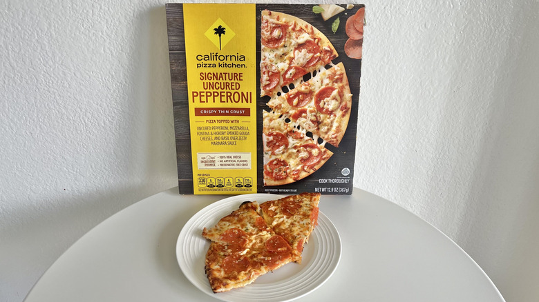 Can you ever go wrong with a pepperoni pizza? California Pizza Kitchen's Thin Crust Signature Pepperoni Pizza comes with a trio of mozzarella, Fontina, and hickory smoked Gouda cheese. It has a nice sprinkle of basil and a marinara sauce base. The pepperoni is a little oily, but that's to be expected; the ingredient is also fragrant and flavorful enough to make it to the top half of this taste test. Pepperoni is a classic for a reason. The cheese is nice and salty and seems to balance the crust a little bit better — some of the previous pies are light in terms of toppings, so the cheese-to-crust ratio is much better in this pepperoni pizza. The meat also brings a lightly spiced, impressive taste to each bite.