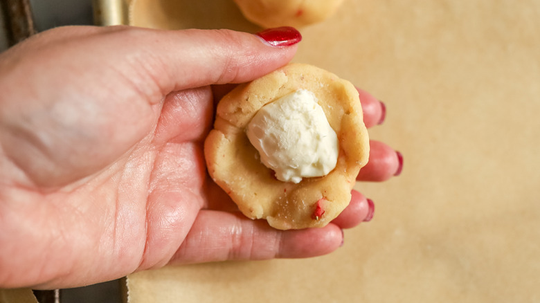 It's also important to pinch or crimp the cookie dough closed around the cream cheese filling. Again, this is to prevent any leakage. After you roll the dough around the cream cheese filling back into a sphere shape, consider slightly flattening the top of each sphere to encourage even spreading once the cookies bake in the oven.