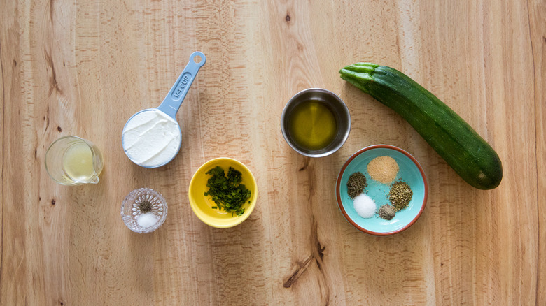 For this recipe, you will first make a mint yogurt dip, and you will need Greek yogurt, fresh mint, lemon juice, salt, and black pepper. For the zucchini chips, the ingredients are zucchini, extra virgin olive oil, garlic powder, dried thyme, dried oregano, salt, and black pepper.