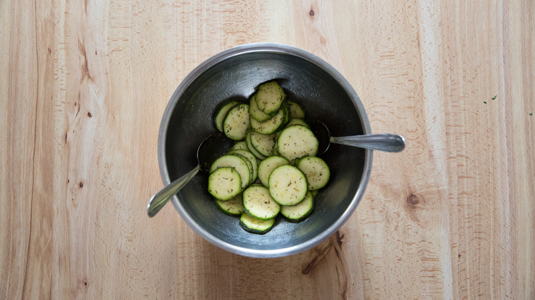 - Place the zucchini rounds in a mixing bowl with the oil and seasonings and toss well to coat the rounds evenly.