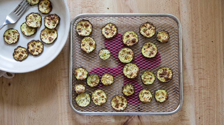 There's no need to run to the store the next time you have a hankering for colorful and salty veggie chips — they can easily be made at home. Air fryer zucchini chips are just one of the recipes you can make in an air fryer, a convenient appliance that helps you make delicious crispy dishes without deep frying them in fat or firing up the oven. Zucchini is a great option for veggie chips because it's easy to slice, it already comes in just the right shape and size, and it's a nutritious, low-calorie, non-starchy vegetable. Those avoiding white potatoes may especially appreciate this treat.