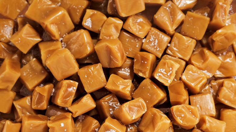 This type of caramel also uses way less dairy, or even none at all, so the syrup solidifies quicker and becomes brittle rather than bendable. Since hard caramel needs to be cooked hotter, there's no need to significantly cool it down with extra ingredients, though you certainly can add a splash of cream. Using zero dairy, you can create thin, glass-like caramel shards, while a dairy-enriched mixture makes for hard yet creamy and opaque candies — the kind your grandparents might give to you in individual wrappers.