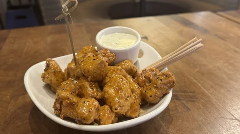 Yard House has been serving Gardein offerings since 2011, and today, the chain offers an entire Gardein menu section, which includes Orange Chicken, a BBQ Chicken Salad, Nashville Hot Chicken and Pancakes, Chicken Nachos, and a Grilled Chicken and Avocado Sandwich. Taste-wise, the vegan wings come with a choice of two sauces (our reviewer ordered the Whiskey Black Pepper Sauce). On texture, however, Yard House's meatless appetizer leaves much to be desired. As our omnivorous reviewer noted, "The biggest difference between [the Gardein wings and the boneless chicken wings] was there was no crunch to these chicken-free wings. That lack of texture was definitely a major letdown and why it's last on the list."