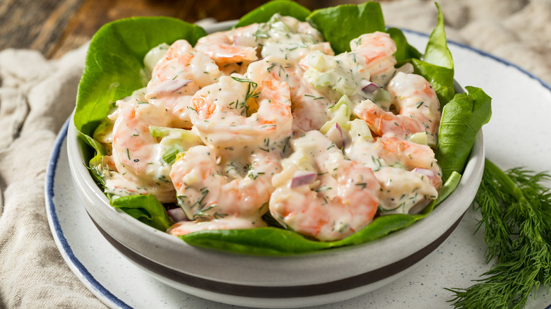 Although you can keep it classic with those ingredients that often go into tuna salad, there are some other ingredients that pair well with the shellfish. Take the seafood inspiration further and add Old Bay seasoning to the bowl. Or take it up a notch and add imitation or canned crab meat along with the shrimp. When it's time to assemble the sandwich, we think croissants or a thick, toasted bread are ideal vessels for the shrimp salad, along with some lettuce to act as a barrier between the bread and creamy dressing.