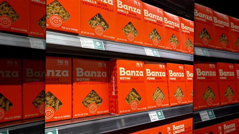 Banza pasta comes in a bright orange package that screams "pick me." The product itself backs up the bold packaging; as far as Whole Foods' pasta brands go, nothing stacks up to Banza in terms of added nutrition. Thanks to the inclusion of chickpea flour (the label also contains pea starch, xanthan gum, and tapioca starch), each box of Banza pasta contains, at minimum, 20 grams of protein and 8 to 13 grams of fiber per serving. The choice to use chickpea flour is a sustainable one. Chickpeas (and legumes like them) are known to remediate soil quality, while also being a drought-resistant crop. In fact, Banza has received a CleanScan certification from The Detox Project, which guarantees the products don't contain glyphosate or residue of pesticides.