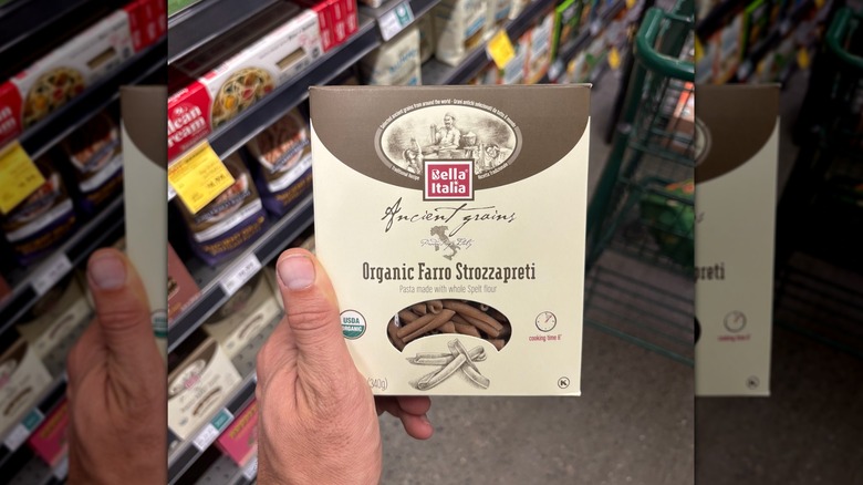 Let's say you see the box. At $6.50 for a 12-ounce box, the price doesn't scream "buy me." Not if you look at pasta through an economic lens, at least. As a total package, though, here's where it's worth it. Bella Italia has the valuable novelty of being a company focused on unique ancient grains. Spelt farro strozzapreti, teff penne, and Kamut fusilli — a wheat berry-like grain thought to originate in the Fertile Crescent — were available at our local Whole Foods.
