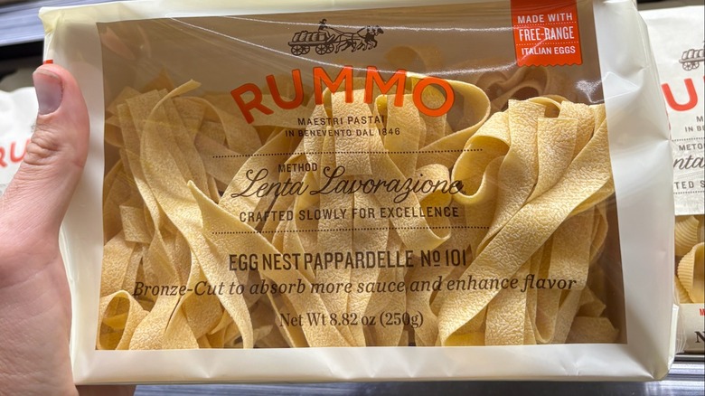 At first glance, the package of Rummo I picked up from the shelves looked like a piece of cracked leather. I might have even mistaken it for a tortilla strip. Mexican food it was not, however, but a nest of egg noodle tagliatelle. Craggy texture is a great sign when it comes to pasta, and Rummo delivers on that. It's indicative of the company's longevity with milling flour, which it's done since the mid-1800s. There's a 7-step process to making this pasta, which results in a noodle that's supreme at maintaining al dente texture after cooking.