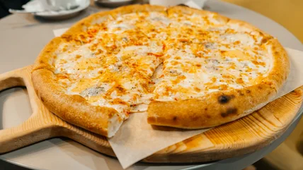 On the sweeter side, look for a frozen cheese pizza with white sauce rather than marinara. This one could be topped flatbread-style with gorgonzola, pear, honey, fresh sage leaves, and a drizzle of high-quality olive oil. Or, if you're feeling fancy (or hosting last-minute), you could top a frozen cheese pizza with blue cheese, fig, asiago, and speck for a dinner-party-worthy pie.