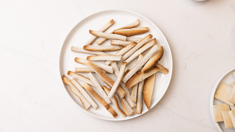 Alternatively, you can take a sweet approach with leftover bread crusts. French toast sticks are a quick and delicious way to use up any crusts, and their drier, harder consistency is ideal for soaking up classic French toast custard. Simply dip the crusts into custard and then fry them up in a pan, and voila, you've got French toast sticks. Bread pudding is another great way to use up leftover crusts, repurposing them into a rich and comforting spiced dessert. Of course, you can also just whizz up the bread crusts into crumbs and toast them in the oven for a few minutes, to give yourself a home made batch of breadcrumbs ready for coating anything from fish to croquettes.