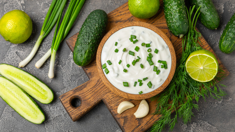 When you've already got fatty meat, melted cheese, and hefty bread buns stacked on top of each other, tzatziki can be quite the palate cleanser. The moment the grilled patties' heat comes into play, the sauce instantly cools your taste buds with its freshness. Greek yogurt — an absolute must have in tzaztiki sauce, gives it the mildly tangy base that balances out a burger's richness. Tagging along is a swirl of hidden complexity, where soothing cucumber and aromatic herbs dance with pungent garlic while acidic lemon juice sparkles in the back. That's the multifaceted beauty of tzatziki — it can bring a whole other flavor dimension to your dish while still keeping things pleasantly light.