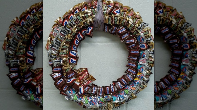 Your sweet tooth can help you create some seriously sweet-looking decorations for your home. If you've tried making pretzel wreaths with chocolate and pretzels, you'll love this much easier task that requires no melting of chocolate or dusting of sprinkles. While there are different ways to approach making a candy wreath, using a glue gun can make your life simpler as you affix pieces onto a store-bought form made up of wire or styrofoam. You can use any kind of candy you like — peppermints, mini Snickers, packages of M&Ms, or even popcorn — to build artful-looking decorations.