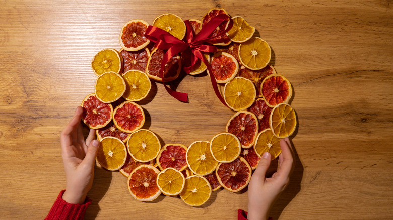 You can glue dehydrated wheels on top of each other or use a form to create depth and make your efforts to build a circular shape a bit easier. Try alternating pieces of grapefruit, orange, lemon, and lime for a more colorful creation. Once you have the core components of your wreath in place, cinnamon sticks and star anise pods can add not only aesthetic interest but bring an aromatic element to your creations, as can sprigs of rosemary and dried pieces of lavender. Tie your work of art with a colorful ribbon or set the pieces onto a table to place candles or flower vases for crafty tablescapes.
